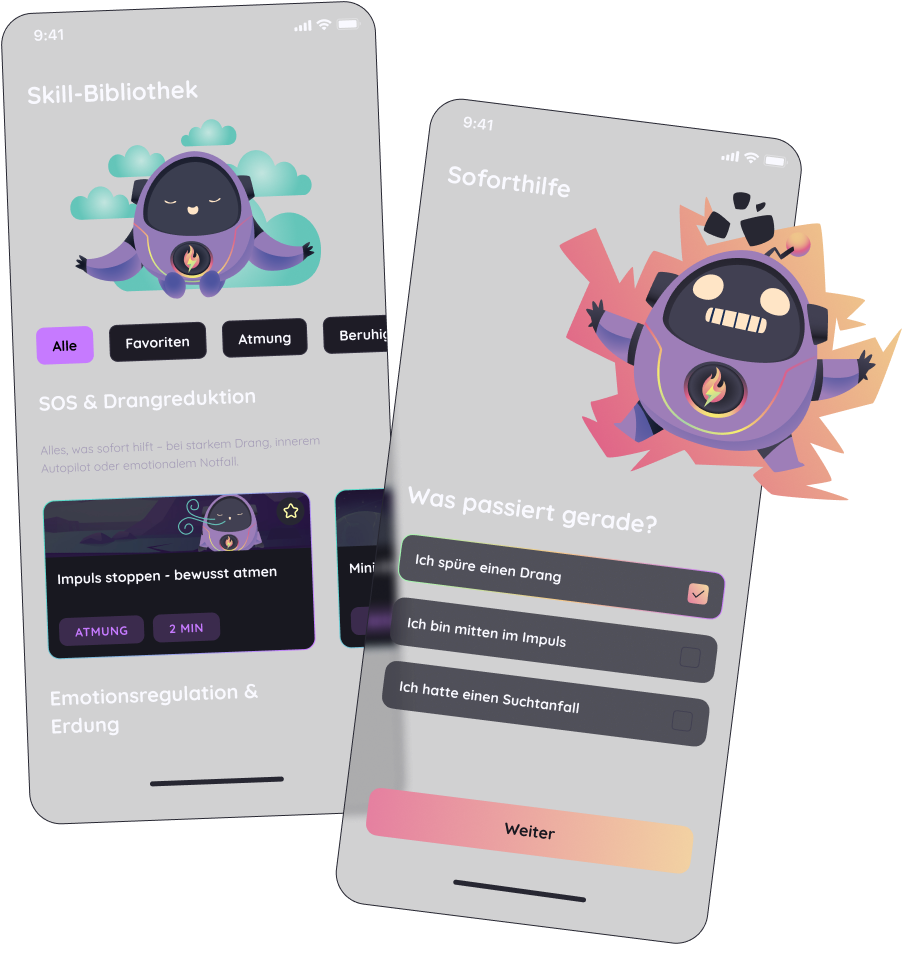Ob es um Essgewohnheiten geht, Substanzen, Selbstverletzung oder andere Impulse – wir verstehen, dass Veränderung mehr braucht als Willenskraft. Du brauchst einen mitfühlenden Begleiter, der genau dann da ist, wenn's drauf ankommt.